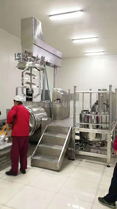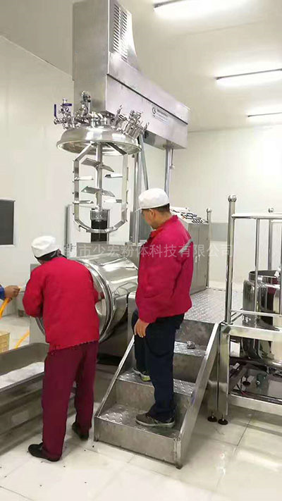物料在水鍋、油鍋內(nèi)通過加熱、攪拌進行混合反應(yīng)后,由真空泵吸入乳化鍋,通過乳化鍋內(nèi)上部的中心攪拌、聚四氟乙烯刮板始終迎合攪拌鍋形體,掃凈掛壁粘料,使被刮取的物料不斷產(chǎn)生新界面,再經(jīng)過葉片的剪斷、壓縮、折疊,使其攪拌、混合而向下流往鍋體下方的均質(zhì)器處,物料再通過高速旋轉(zhuǎn)的切割輪與固定的切割套之間所產(chǎn)生的強力的剪斷、沖擊、亂流等過程,物料在剪切縫中被切割,迅速破碎成200um-0.2um的微粒,由于乳化鍋內(nèi)處于真空狀態(tài),物料在攪拌過程中產(chǎn)生的氣泡被及時抽走。采用抽真空的方式,使所生產(chǎn)的制品在攪拌過程中不再混入氣泡,從而保證可制造出富有光澤、細膩及延展性良好的產(chǎn)品。